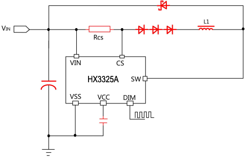 HX3325是一款內置40V、5A功率MOS開關降壓型高精度、高亮度LED恒流驅動控制器。HX3325通過一個外接電阻設定輸出電流,最大輸出電流可達2.5A;外圍只需很少的元件就可以實現降壓、恒流驅動功能,并可以通過DIM引腳實現輝度控制功能。